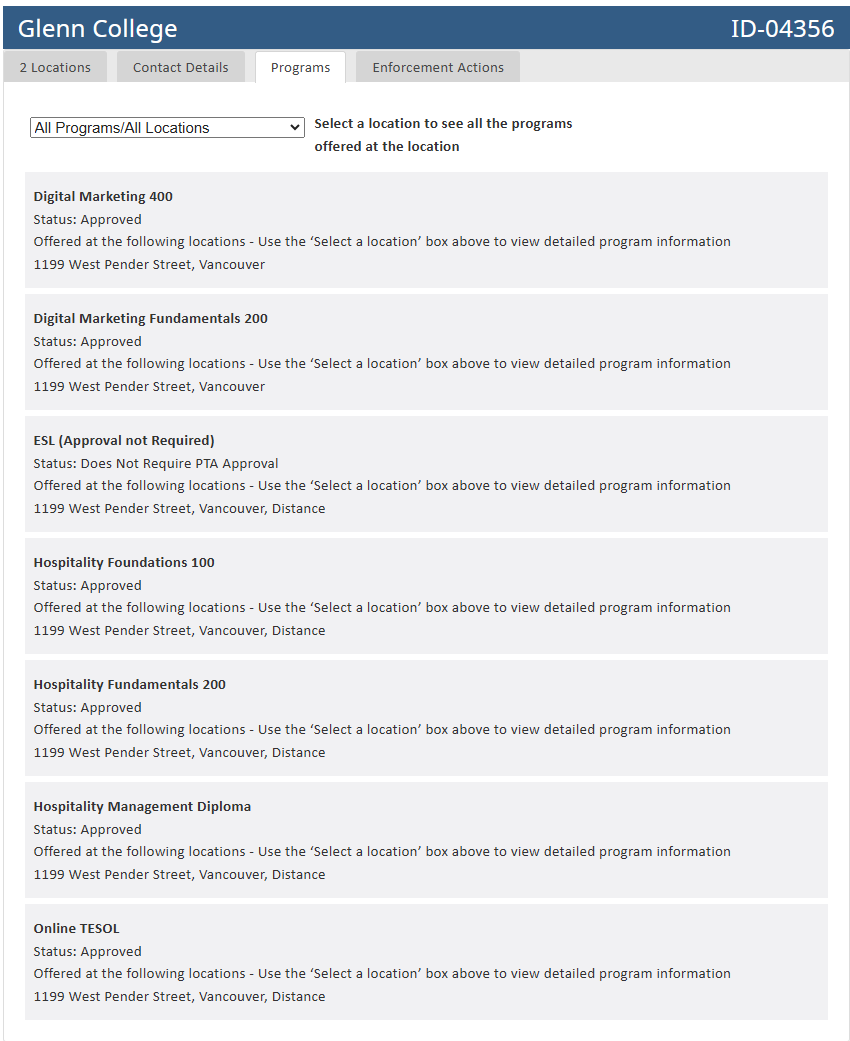An important point is that Glenn College is an educational institution that has completed registration with the PTIB, the Canadian government education department.
