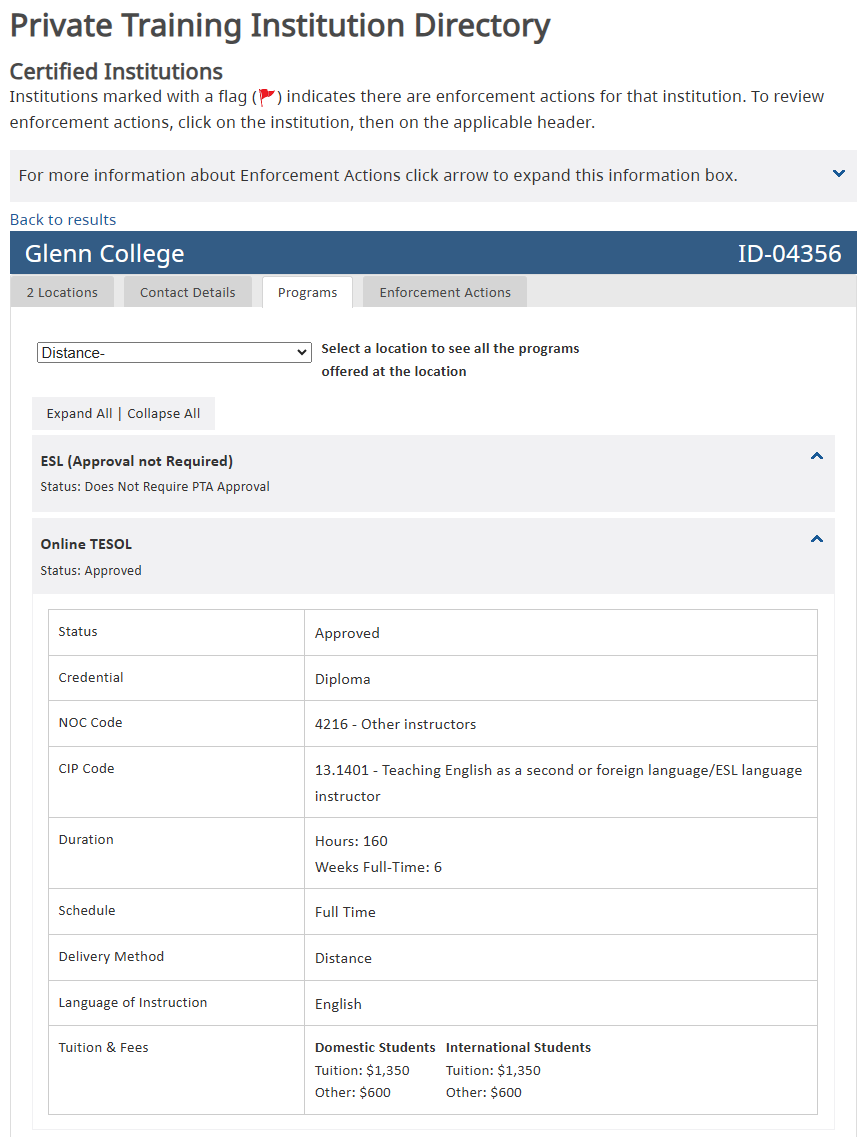 When you click on the TESOL course, Glenn College TESOL is listed as an Approved program and a Diploma program.