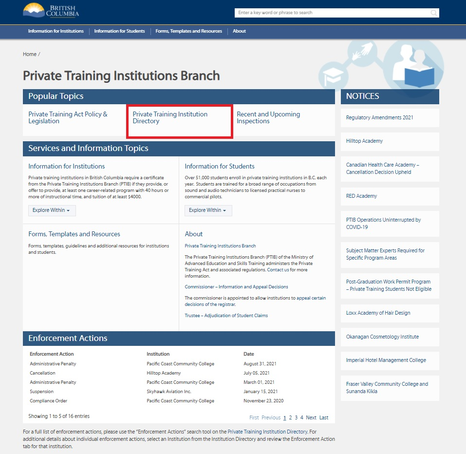 https://www.privatetraininginstitutions.gov.bc.ca/